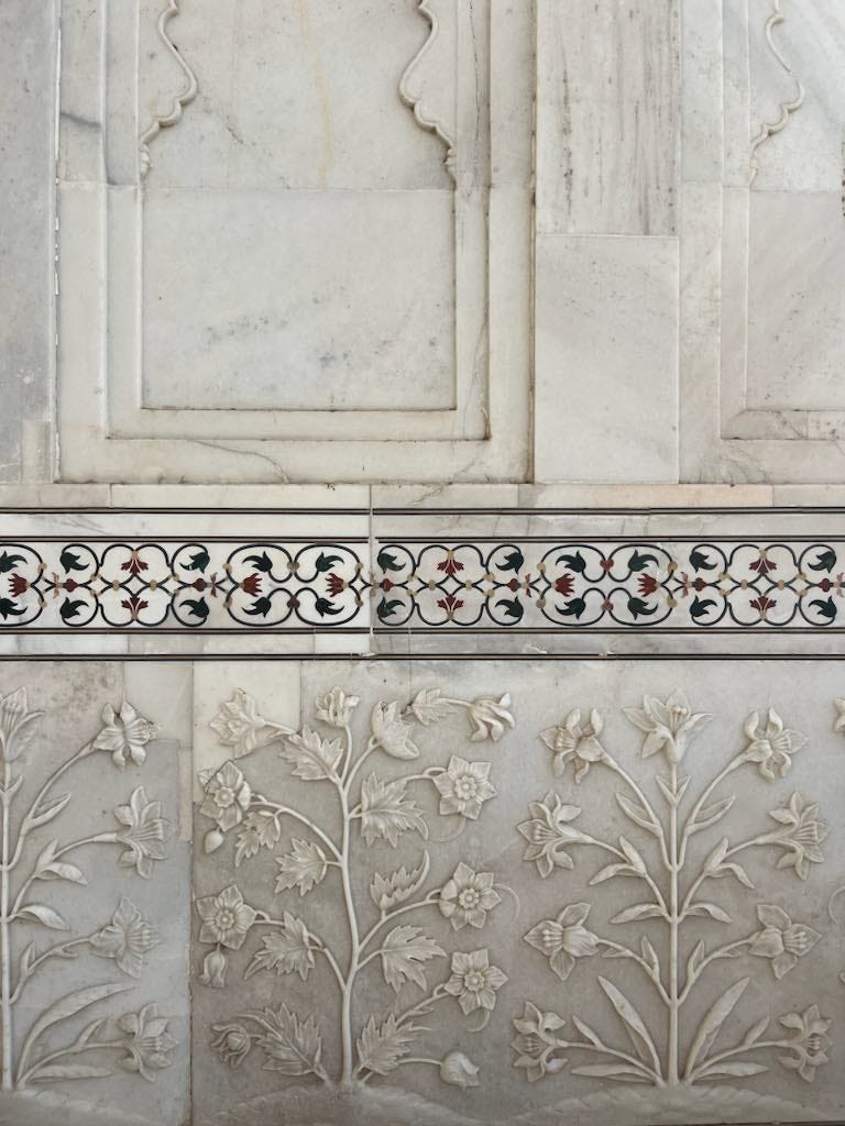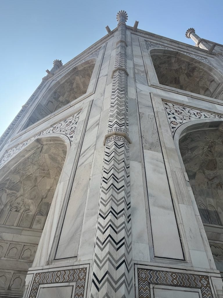 I was left in awe not because of the grandeur or stature, but rather the details: thousands of golf ball sized floral inlays with 64 distinct pieces, a frivolous commitment to symmetry and optical satisfaction, a blueprint that took years itself to draft onto Persian carpet, not parchment. Around nine thousand descendants of the original twenty thousand artisans who built the Taj live and work in Agra today. Many are employed by UNESCO to preserve the Taj and sites around the world. They are also some of the only individuals in the world permitted to work with Makrana marble.