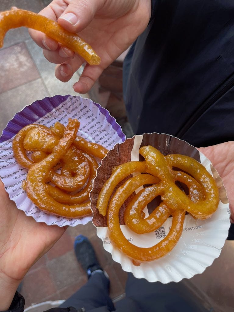 We began our quest with the market’s legendary street food (duh). We stitched together a menu via a route of recommendations. The first stop was for jalebi (a fried dough covered in sugar syrup). The only other man in line was friendly and spoke great English. He kindly bought our sticky pastries and asked where we were from (LA! New York! Wild!) in between our first bites. Syrup oozed onto my flimsy paper plate, when he pointed to me and explained that my face had good karma, but that I could do without being so emotional. My Pisces spirit felt seen.